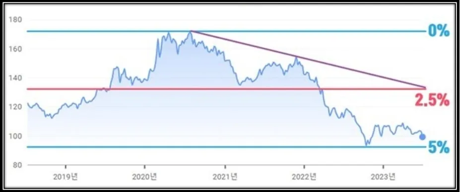 따라서, 앞으로 TLT가 반등한 이후 고점은 전고점 대비 하락폭의 절반 정도만 되돌리는데 그칠 수도 있다는 가능성을 염두에 두고 투자하는 것이 좋습니다.